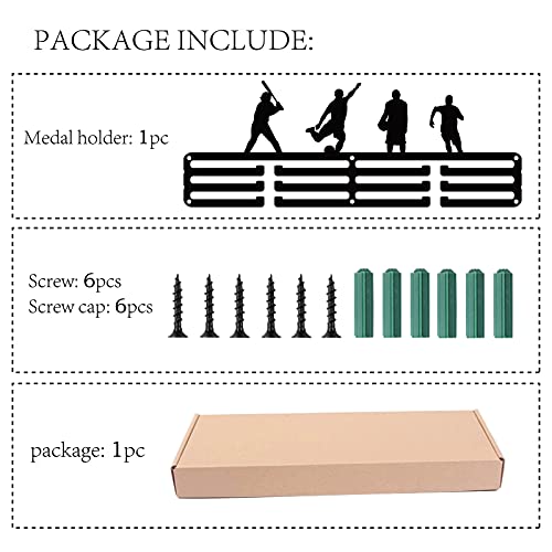 [ZWARTE MEDAL HANGER & ANKER & Schroeven]: 1 st x zwarte metalen houder, afmeting: 40 x 15 cm. Dikte: 0,15 cm. Diameter gat: 0,5 cm; 6 stuks x schroef nagel, 0,9 inch /2,4 cm; 6 stuks x ankers, 1 inch/2,6 cm. De 3 rijen en 12 aparte haken, hangen meer dan 60 medailles