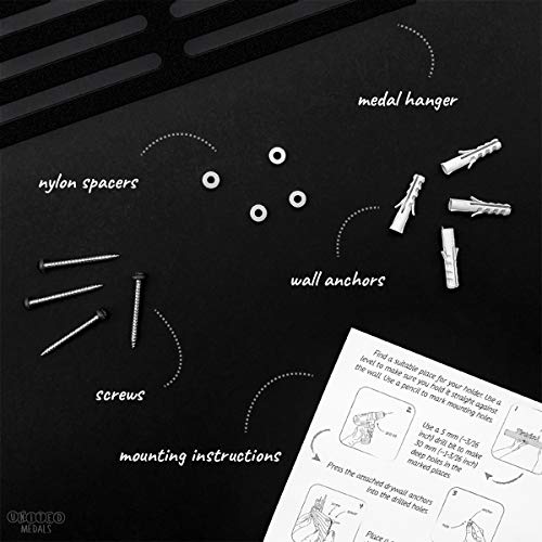 De display wordt geleverd met alle benodigdheden om hem aan de muur te bevestigen, inclusief een set universele schroeven, muurpluggen, 3mm nylon afstandhouders, en gedetailleerde instructies voor montage. Met een minimum aan gereedschap en het volgen van de eenvoudige stappen is een United Medals medaille hanger in slechts enkele minuten bevestigd aan de muur.